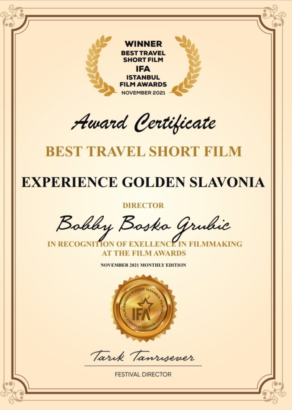 Promotivni film Turističke zajednice Požeško-slavonske županije Experience Golden Slavonia osvojio je nagradu u kategoriji Best travel short film - najbolji kratki putopisni film na IFA Istanbul filmskom festivalu!